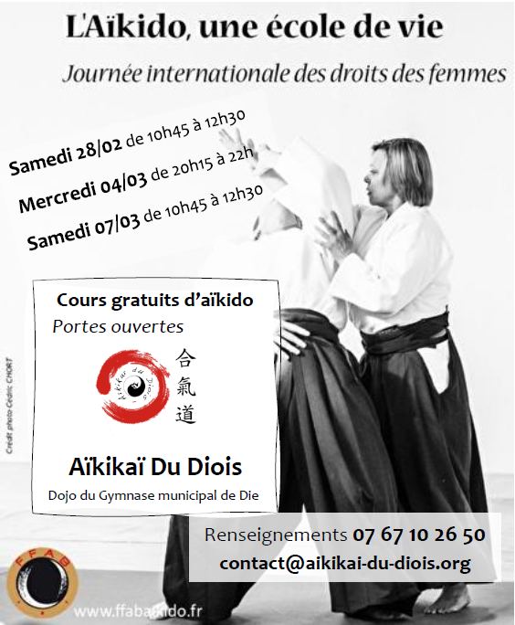 À l’occasion de la journée internationale des droits des femmes, l’Aïkikaï Du Dois ouvre ses portes pour vous proposer trois cours gratuits :